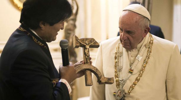 El papa Francisco ha recibido del presidente de Bolivia, Evo Morales, una imagen de Cristo crucificado tallada sobre la hoz y el martillo, símbolo del comunismo, la doctrina totalitaria y cruel culpable del asesinato de mas de cien millones de personas y de la opresión de otros muchos millones de seres humanos, privados de libertad frente a estados brutales. Tal vez el papa debió negarse a recibir el regalo como rechazo a la opresión y la esclavitud que representó el comunismo para tantos hijos de Dios.