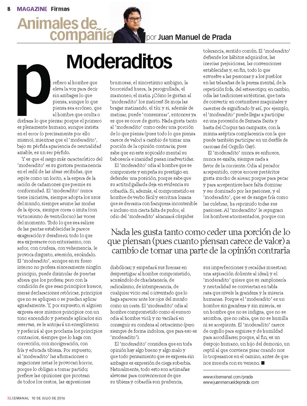 El 'moderadito' defiende los hábitos adquiridos, las inercias prejuiciosas, las convenciones establecidas y, en fin, todo lo que envuelve a las personas y a los pueblos en las telarañas de la pereza mental, de la repetición fofa, del estereotipo; en cambio, odia las tradiciones auténticas, que trata de convertir en costumbres maquinales y carentes de significado (y así, por ejemplo, el 'moderadito' puede llegar a participar en una procesión de Semana Santa y hasta del Corpus tan campante, con la misma aséptica complacencia con la que puede también participar en un desfile de carrozas del Orgullo Gay).